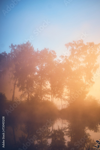Fototapeta premium Sun rising over foggy lake. High quality photo