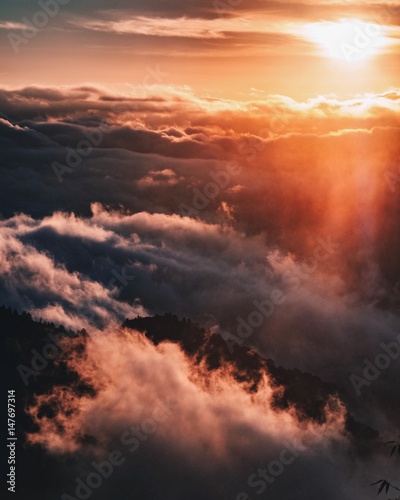 © Bryan, Fototapeta premium Sun rising through foggy mountain texture