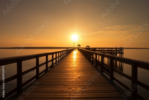 © juliars, Fototapeta premium Sun sets perfectly in line with a tranquil wooden pier extending into still waters, reflecting warm light