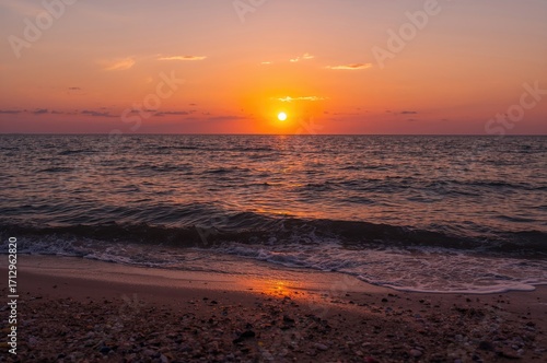 © vxnaghiyev, Fototapeta premium Sun setting beyond the sea horizon