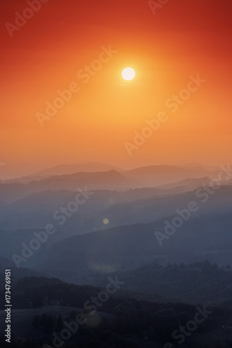 Fototapeta premium Sun setting orange sky above layered rolling hills with atmospheric haze. Capturing serenity and natural beauty at dusk