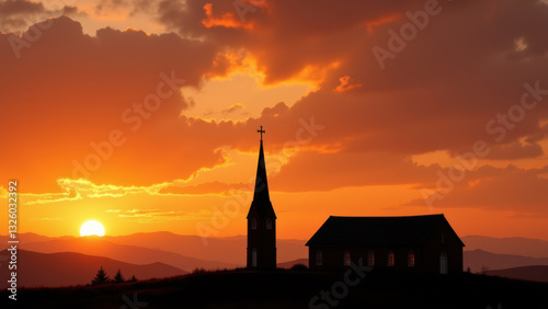 © Tameem, Obraz premium Sun setting over a rural church under a dramatic sky with clouds.