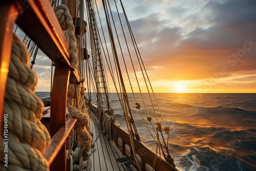 © Andrii, Fototapeta premium Sun Setting Over Ocean on Ship, Tranquil Evening Scene With Golden Sky