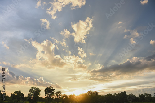 © Aphisith, Fototapeta premium Sun setting over trees and field with dramatic, streaked sky.
