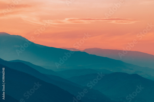 Fototapeta premium Sun setts over Caucasus Mountains. Joyful motivational bright colorful...