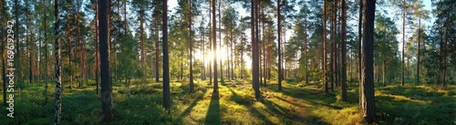 © Canvas, Fototapeta premium Sun shines between trees in serene forest scene, casting long shadows on the green forest floor. Light creates a peaceful, natural atmosphere