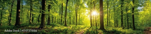 Naklejka premium Sun shines through tall trees in a lush, vibrant forest. The ground is...