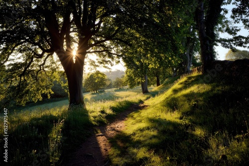 Obraz premium Sun shines through trees trunk illuminating a dirt path in a grassy hilly...