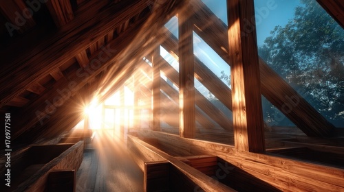 Obraz premium Sun Shines Through Wooden Beams in Loft During Daytime, Creating a Warm and Inviting Atmosphere