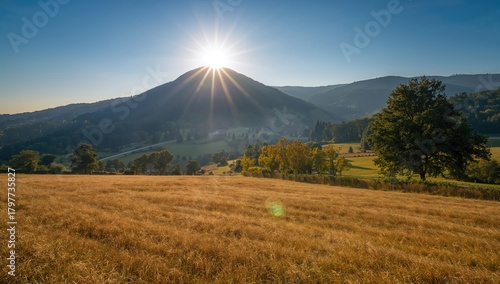 Obraz premium Sun shining brightly in a clear sky over a mountain and dry grassland with tall trees, seasonal change