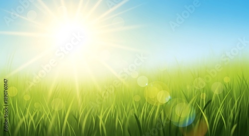 Obraz premium Sun shining brightly over a lush green grass field on a clear blue day from a...