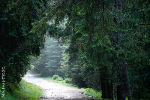 Fototapeta premium Sun shining over forest lane. Country road, path through pine forest.