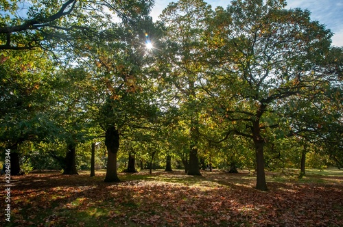 Naklejka premium Sun shining through a London park in Autumn, Greenwich, London