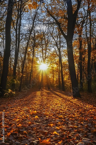 Fototapeta premium Sun shining through autumn trees with fallen leaves on ground