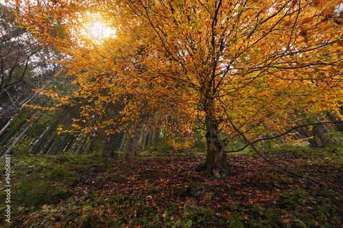 © kishivan, Fototapeta premium sun shining through autumn treetops