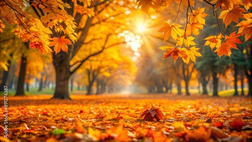 © Tima, Fototapeta premium Sun shining through canopy of trees with golden autumn leaves