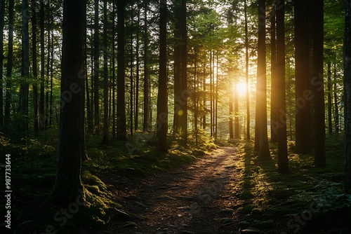 © atar, Obraz premium Sun shining through forest trees in the evening