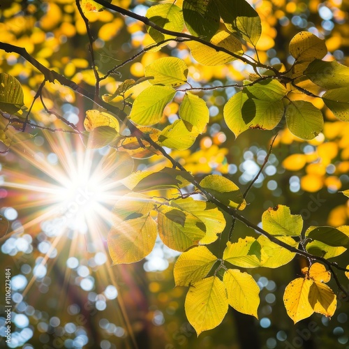 © nsit0108, Obraz premium Sun shining through golden autumn leaves on branch