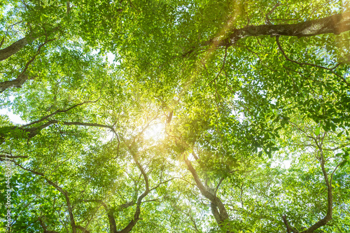 Obraz premium Sun Shining Through green Tree brunches, Low Angle View, background