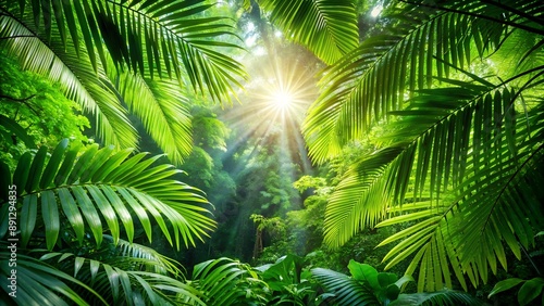 Fototapeta premium Sun shining through lush green foliage in tropical jungle paradise