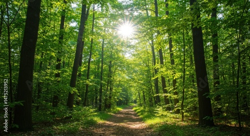 Fototapeta premium Sun shining through the trees in a forest landscape for backgrounds and...