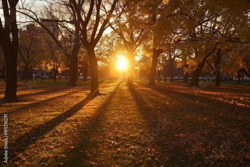 Naklejka premium Sun shining through trees casting shadows in park setting, A golden sunset...