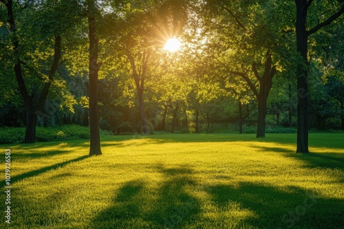 © Abdul, Fototapeta premium Sun shining through trees in a forest.