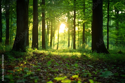Naklejka premium Sun shining through trees in a lush green forest. Nature, environment,...