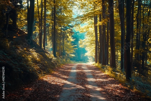 © atar, Fototapeta premium Sun shining through trees in forest, creating a magical, woodland path