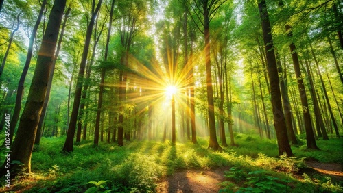 Fototapeta premium Sun shining through trees in summer forest