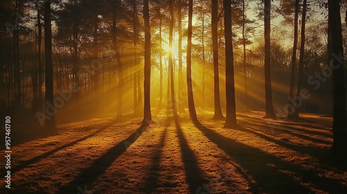 © Igor, Fototapeta premium Sun shining through trees in winter forest with grass in foreground