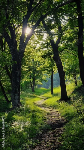 © atar, Naklejka premium Sun shining through trees on a path in a green forest