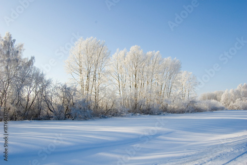 Obraz premium Sun Shining Through Winter Trees. Winter landscape.