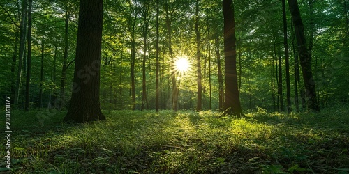 Fototapeta premium Sun shinning through the thick forest in summer.