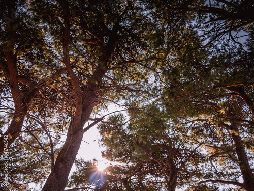 Fototapeta premium Sun through pine trees