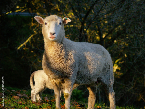 Fototapeta premium Sun through trees illuminates lambs in shade