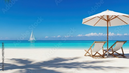Obraz premium Sun umbrellas and wooden beds on tropical beach