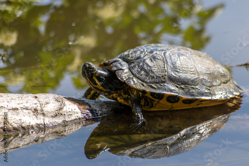 Obraz premium Sunbathing turtle at the shore of a lake warming up in the sunshine as...