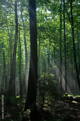 © Aleksander Bolbot, Naklejka premium Sunbeam entering hornbeam deciduous forest