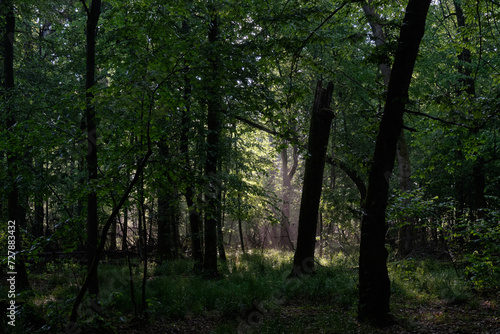 © Aleksander Bolbot, Naklejka premium Sunbeam entering rich deciduous forest