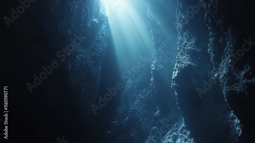 Obraz premium Sunbeam illuminating dark underwater cave.