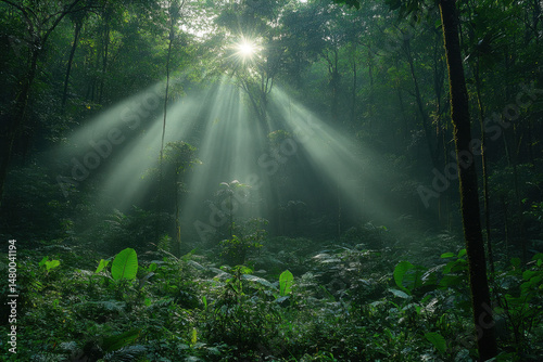 © Nail, Fototapeta premium Sunbeam piercing through dense jungle foliage.