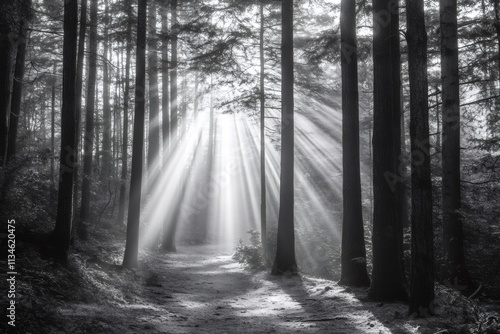 Naklejka premium Sunbeams are filtering through trees in a black and white misty forest...