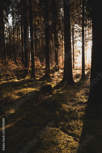 © Fabian, Obraz premium sunbeams between the tree trunks