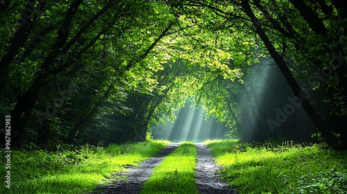 © Raitalinn, Obraz premium Sunbeams break through the trees, illuminating a serene forest path.