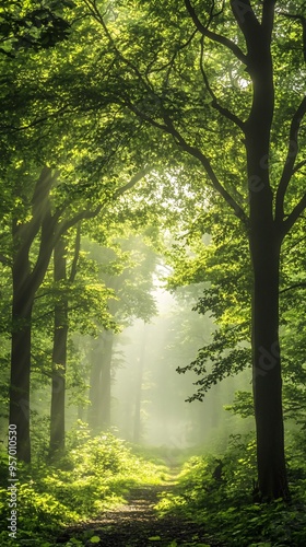© bcendet, Naklejka premium Sunbeams break through the trees in a misty forest creating a magical atmosphere, highlighting the path ahead.
