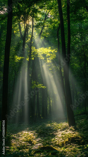 © Muhammad Rizwan, Obraz premium Sunbeams Breaking Through a Calm and Serene Forest Wallpaper