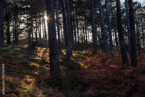 © branislav, Obraz premium Sunbeams breaking through the conifer trees in the woods