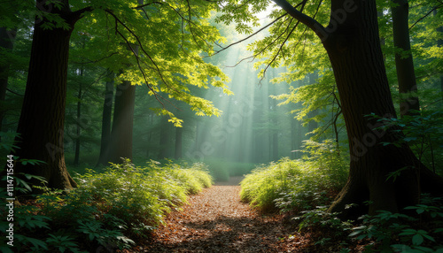 Obraz premium Sunbeams create magical forest atmosphere.