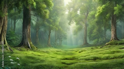 © ArtificialGen, Naklejka premium Sunbeams dance through misty morning woods, painting golden hues on emerald leaves
